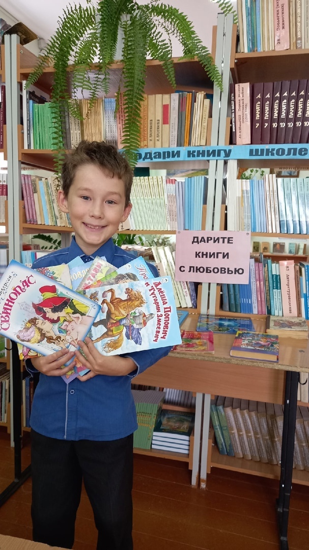 Сегодня школьная библиотека МБОУ СОШ с. Ярославка принимала книжные подарки от Ившина Кирилла, самого активного читателя из 5Б класса.