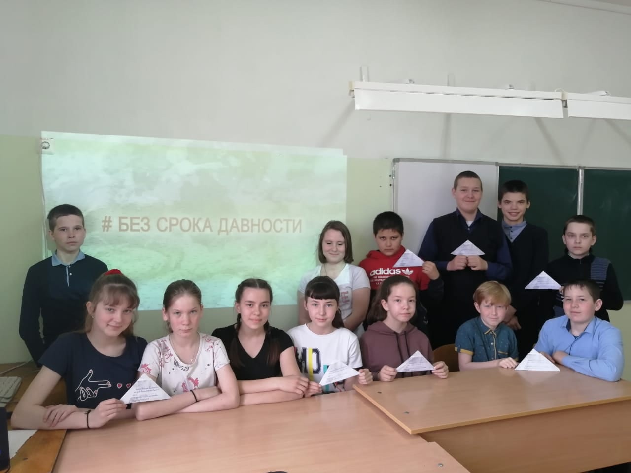 Учащиеся школы просмотрели видеофильм «Без срока давности», изготовленного и рекомендованного к показу Министерством просвещения Российской Федерации. Затем учащиеся написали Письма в будущее «Нельзя забыть» - послания самому себе и своим потомкам в форме треугольного (военного) письма, в котором выражается личное восприятие и позиции обучающегося.